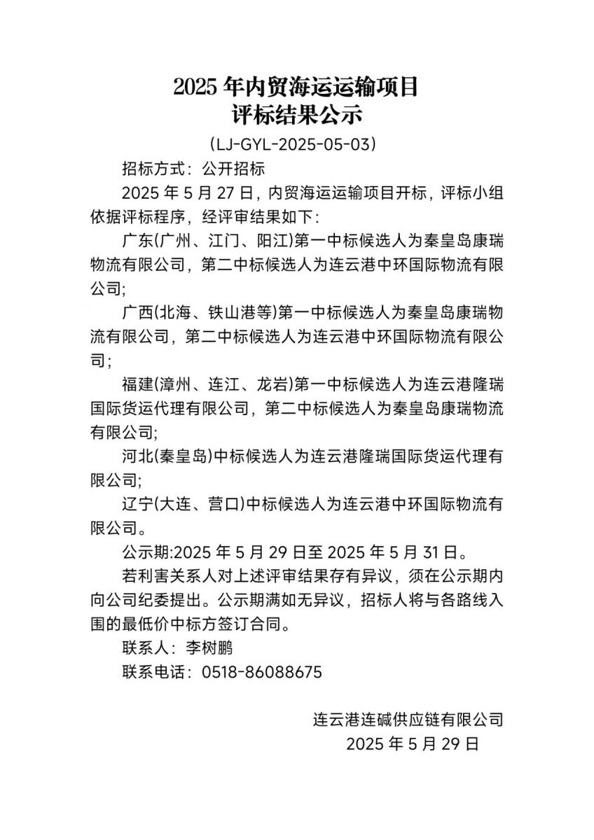 連云港連堿供應(yīng)鏈有限公司2025年內(nèi)貿(mào)海運(yùn)運(yùn)輸項目評標(biāo)結(jié)果公示