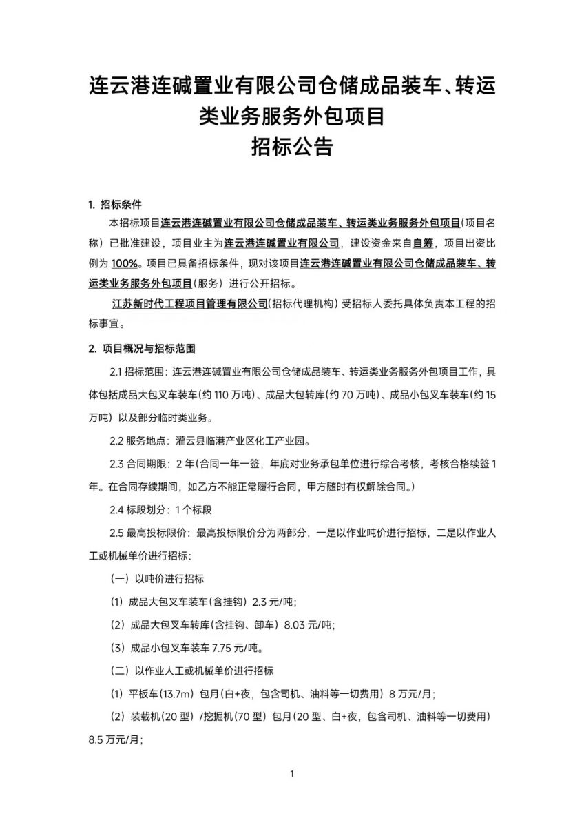 連云港連堿置業(yè)有限公司倉儲成品裝車、轉(zhuǎn)運類業(yè)務(wù)服務(wù)外包項目招標(biāo)公告