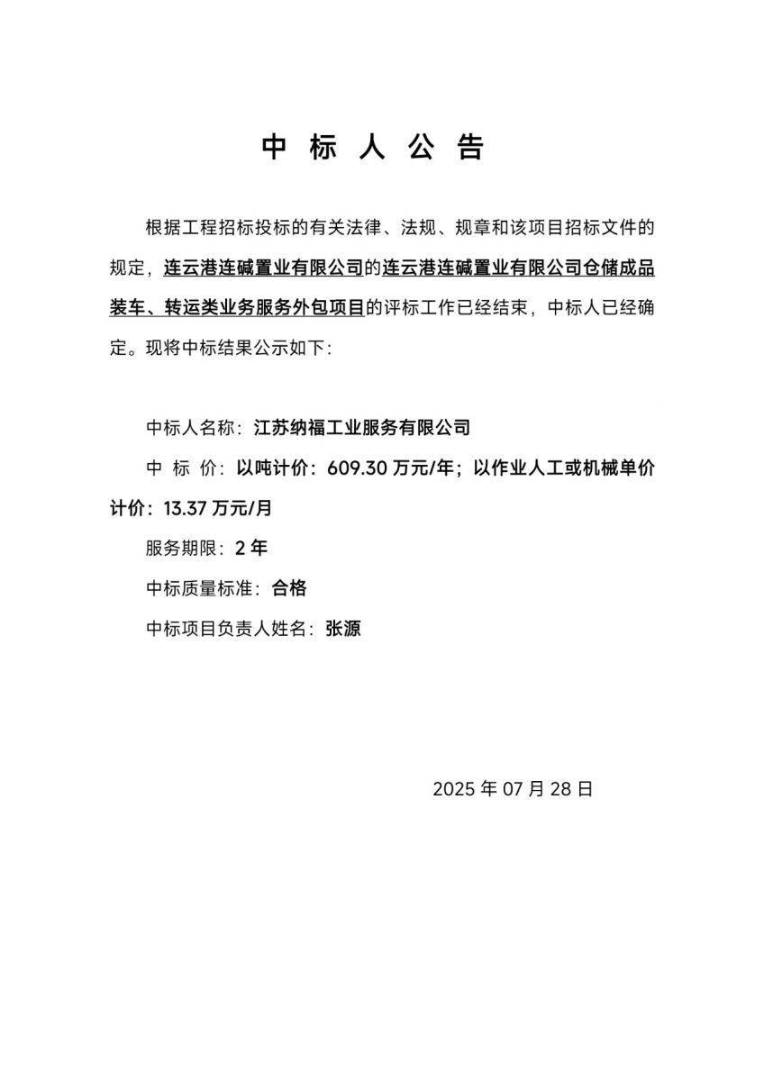 連云港連堿置業(yè)有限公司倉儲成品裝車、轉(zhuǎn)運類業(yè)務(wù)服務(wù)外包項目中標(biāo)人公告
