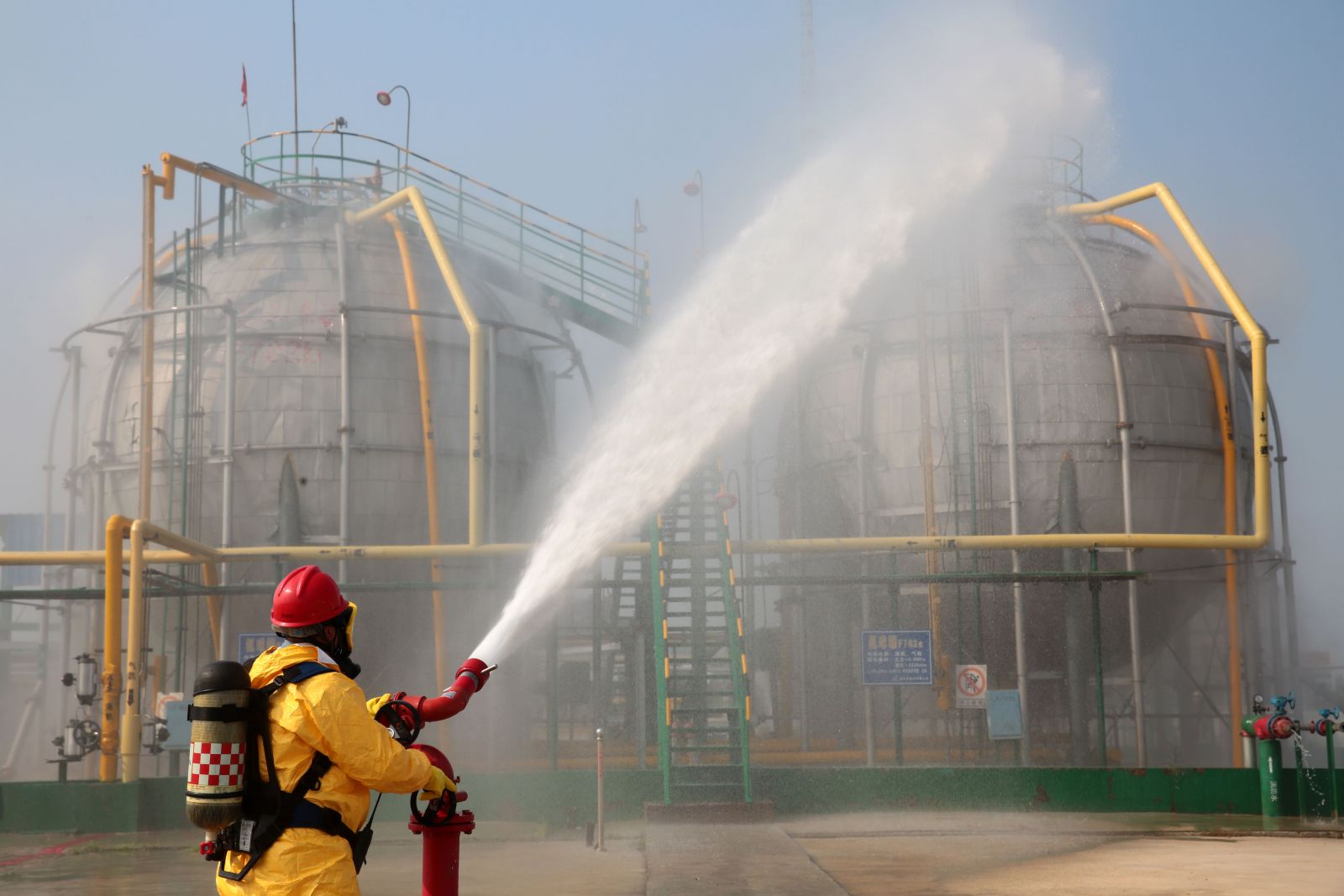 9月5日下午2:30左右,儲(chǔ)運(yùn)車(chē)間液氨庫(kù)操作室DCS操作電腦及SIS系統(tǒng)顯示屏上發(fā)出氨氣超標(biāo)報(bào)警聲,當(dāng)班人員通過(guò)操作室視頻監(jiān)控發(fā)現(xiàn)氨球罐B罐底部發(fā)生泄漏,大量氨氣外泄,現(xiàn)場(chǎng)白霧彌漫。兩名當(dāng)班人員穿戴好防護(hù)用品現(xiàn)場(chǎng)檢查發(fā)現(xiàn)氨球罐B罐底部?jī)x表導(dǎo)液管截止閥(二次閥)損壞,且有一人中毒受傷躺在B球罐底部下方的地面上,立即進(jìn)行應(yīng)急處理,并向當(dāng)班值班長(zhǎng)匯報(bào),啟動(dòng)班組應(yīng)急預(yù)案;后車(chē)間主任接到報(bào)警,啟動(dòng)車(chē)間應(yīng)急程序啟動(dòng);接著公司預(yù)案演練現(xiàn)場(chǎng)應(yīng)急救援指揮部總指揮接到報(bào)警,啟動(dòng)公司級(jí)應(yīng)急預(yù)案,調(diào)動(dòng)各應(yīng)急小組進(jìn)行搶險(xiǎn)救援工作。