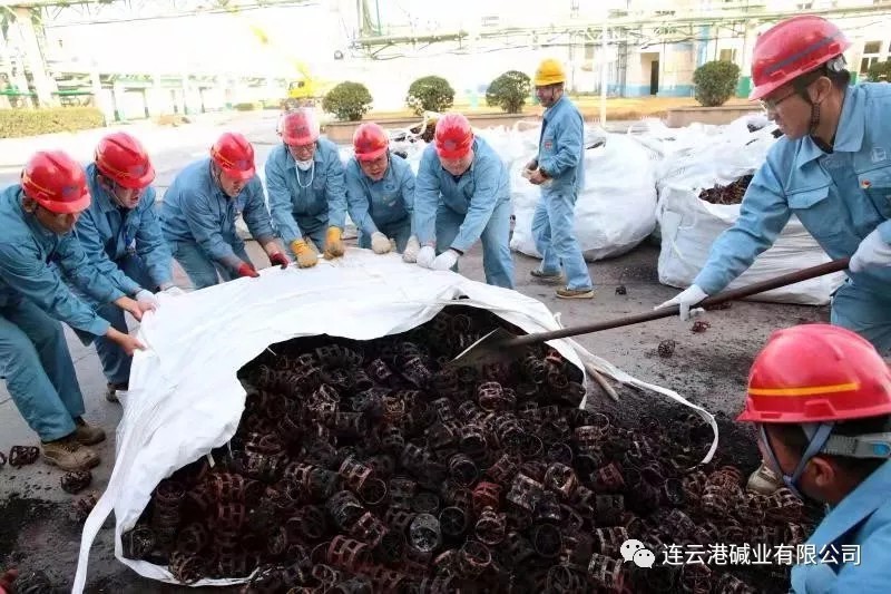 由于清理工作全靠人力完成,崗位人員一邊要維持生產(chǎn),一邊要清理填料,工作量非常大。11月12日下午,公司黨委書記、董事長張衛(wèi)民在調(diào)研重堿車間生產(chǎn)現(xiàn)場時了解到這一情況后,當(dāng)機(jī)立斷,立即組織公司領(lǐng)導(dǎo)及各部門黨員干部義務(wù)勞動,協(xié)助重堿車間完成鮑爾環(huán)填料清理回收工作。