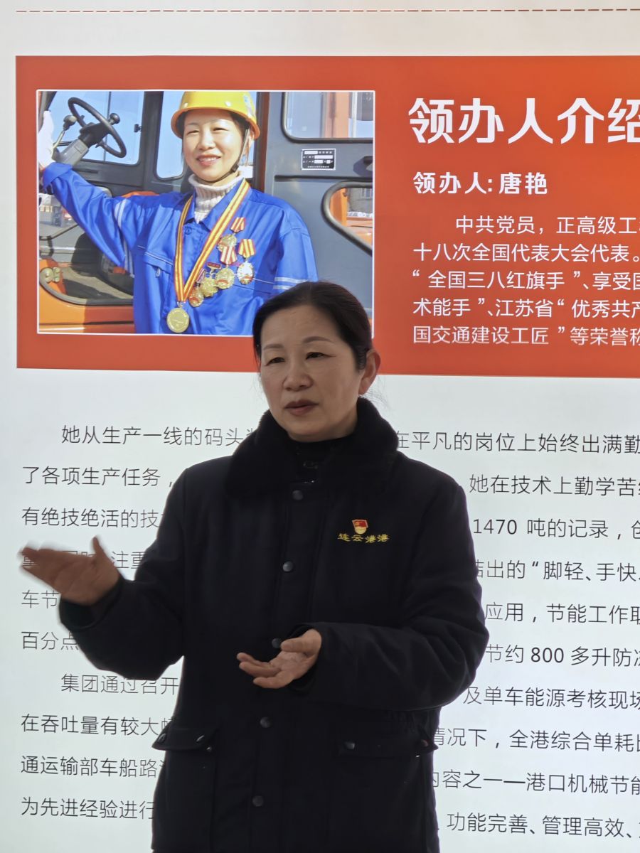 活動第一站,大家乘車前往連云港港口集團(tuán)有限公司,參觀全國勞模唐艷工作室?,F(xiàn)場,勞模唐艷為青年職工們介紹了工作室的情況,講述了自己珍貴的人生經(jīng)歷。唐艷鼓勵大家要樂于奉獻(xiàn)、敢于創(chuàng)新,在平凡的崗位上一步一個腳印,才能創(chuàng)造不平凡的業(yè)績。她的話就像是冬日里的一抹暖陽,為青年職工們的內(nèi)心點燃動力的火焰。