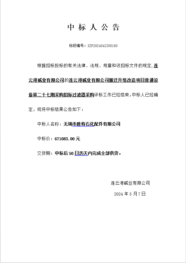搬遷升級(jí)改造項(xiàng)目普通設(shè)備第二十七期采購(gòu)招標(biāo)過(guò)濾器采購(gòu)中標(biāo)人公告