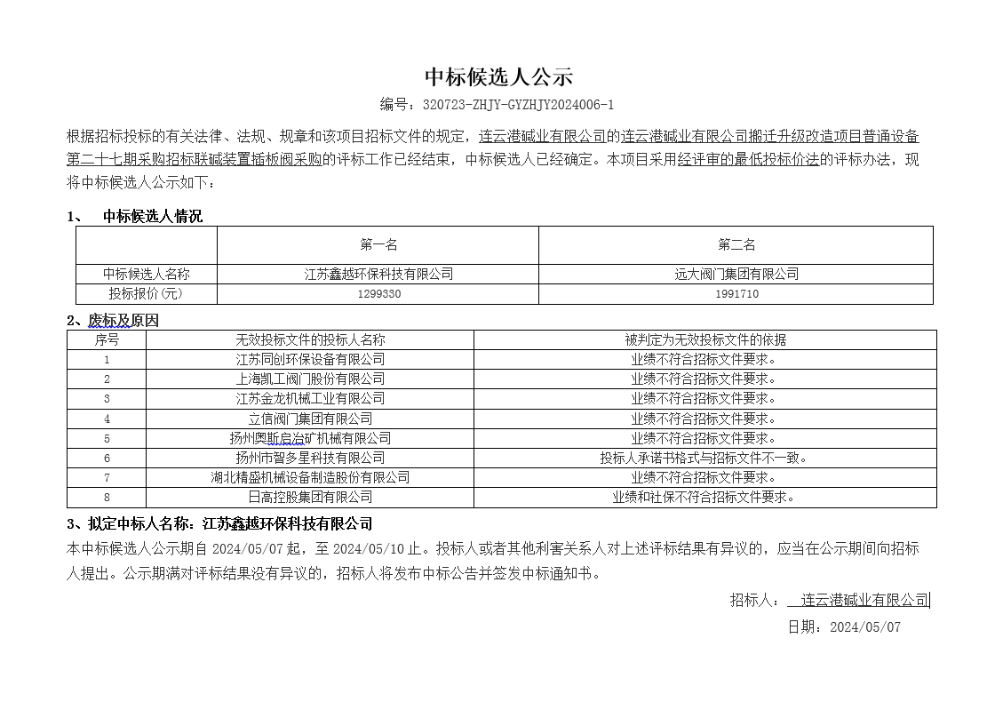搬遷升級改造項目普通設(shè)備第二十七期采購招標(biāo)聯(lián)堿裝置插板閥采購中標(biāo)候選人公示