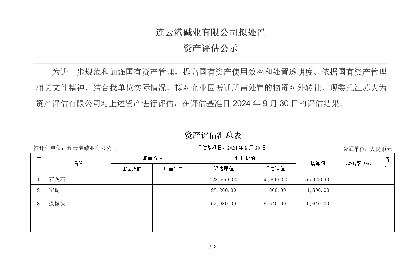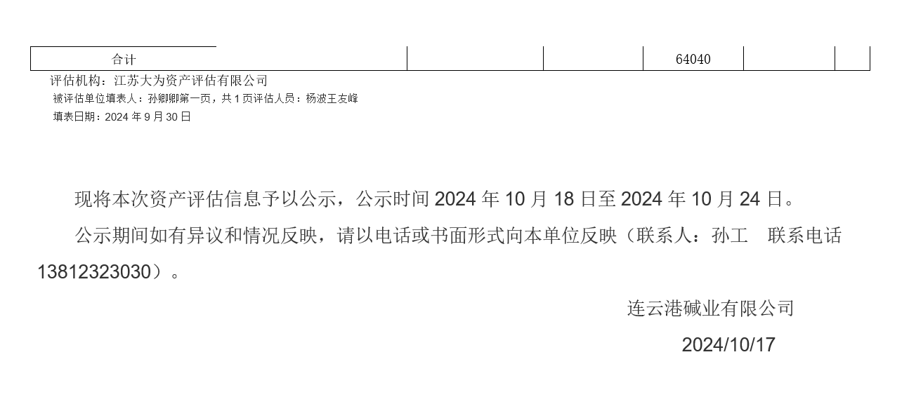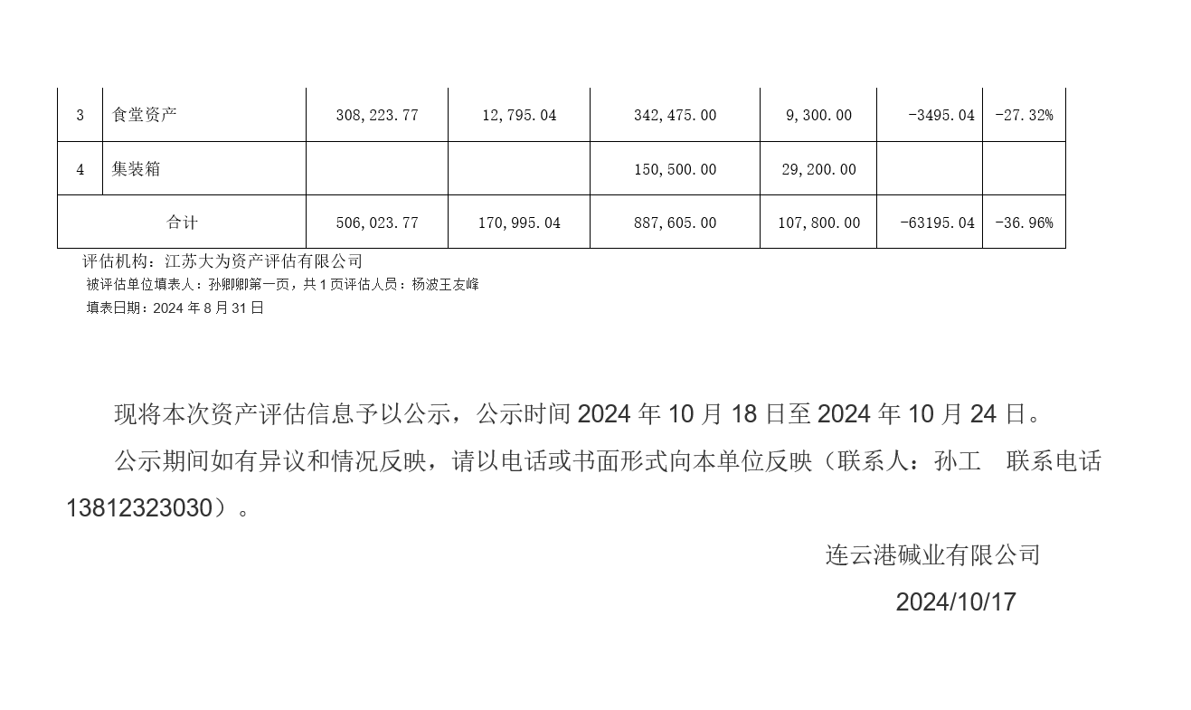 連云港堿業(yè)有限公司老廠區(qū)食堂等廢舊物資資產(chǎn)評估公示