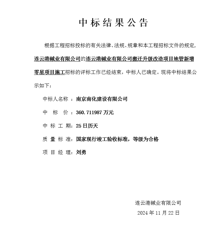 連云港堿業(yè)有限公司搬遷升級改造項(xiàng)目地管新增零星項(xiàng)目施工中標(biāo)結(jié)果公告