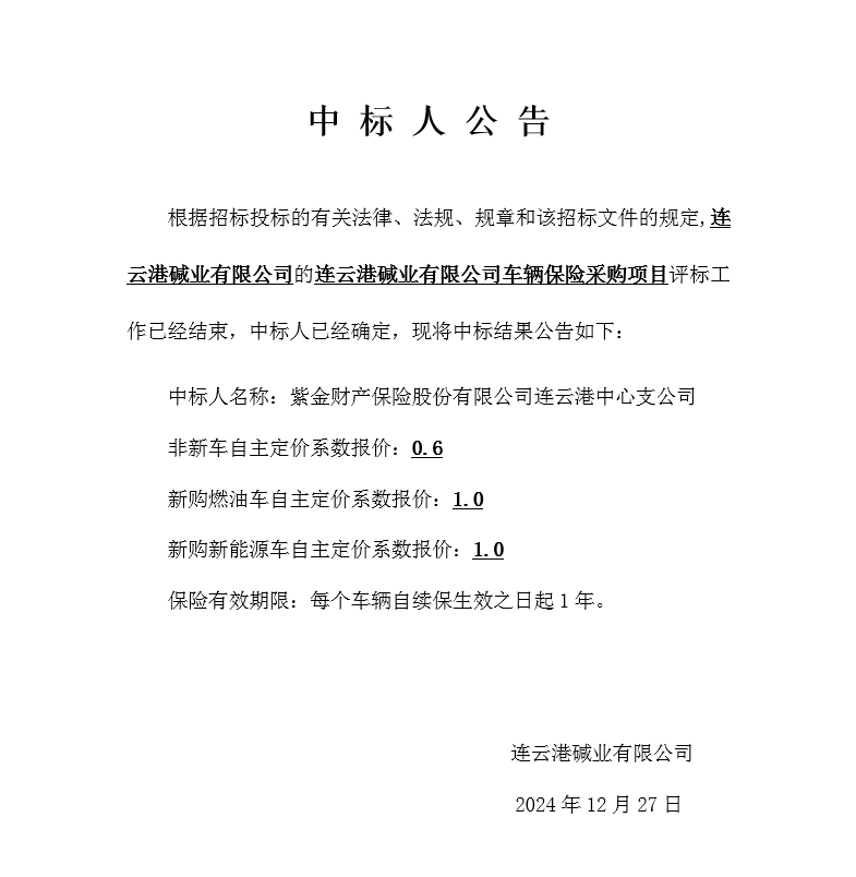 連云港堿業(yè)有限公司車(chē)輛保險(xiǎn)采購(gòu)項(xiàng)目中標(biāo)人公告